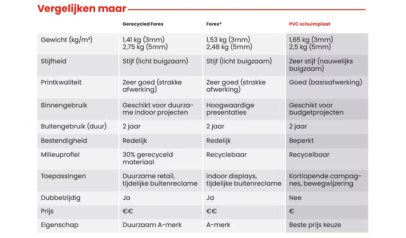 PVC Schuimplaat is de beste prijs keuze wanneer je op zoek bent naar een enkelzijdig paneel. Forex® is het A-merk en met gerecycled Forex® kies je voor duurzaam. Het verschil tussen PVC schuimplaat en (gerecycled) Forex® is eenvoudig te zien in de vergelijkstabel die je terug kunt vinden bij de downloads.